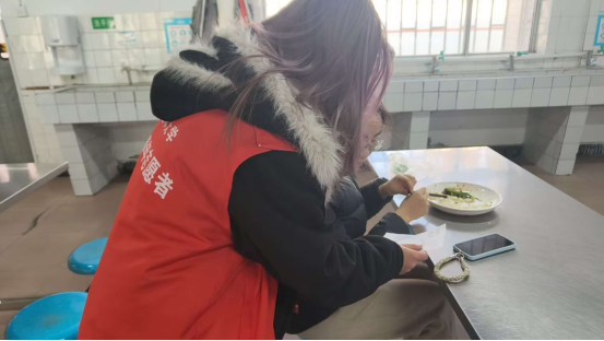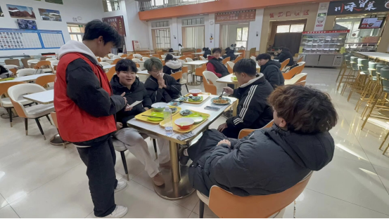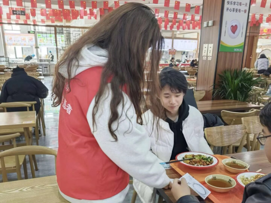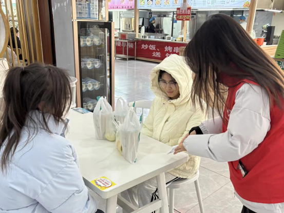 活动前期,志愿者们精心筹备,制作并打印了400份主题海报与调研问卷。活动当日中午,志愿者们率先在西十三宿舍楼下集合,完成活动培训后,依据分组迅速前往各食堂开展服务。在各食堂入口处,志愿者们向来往师生发放宣传海报与问卷;在食堂取餐区,志愿者们化身“节约引导员”,以亲切温和的语气向师生讲解“按需取餐、少量多次”的用餐技巧,主动协助有需要的师生合理搭配餐食,鼓励大家践行“光盘行动”,对未吃完的餐食主动打包。活动过程中,志愿者们严格遵守活动纪律,提前熟悉各食堂人流高峰时段,避开取餐通道开展服务,确保食堂用餐秩序井然。