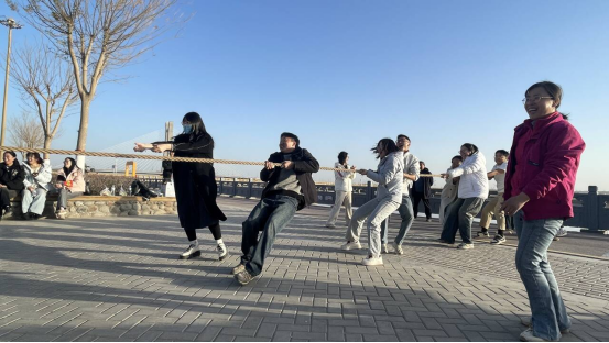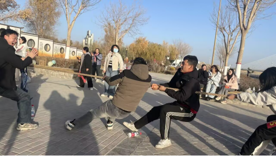 徒步结束后,趣味运动竞技环节随即展开,拔河比赛、“背靠背运球+生僻字认字”“两人三足+普通话绕口令接力”三项特色活动依次登场,将现场气氛推向高潮。