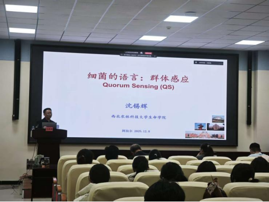 聘任合同签订仪式结束后,沈锡辉教授在塔里木盆地生物资源保护利用重点实验室B302会议室作题为《细菌的语言:群体感应》的学术报告,系统阐述了群体感应及真核生物与原核生物间信号分子的作用机制,suncitygroup太阳集团师生参加报告会。